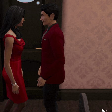 In this interaction, one Sim jumps into the other Sim’s arms, and the other Sim catches them and carries them for a bit while they talk and kiss a few times. This one is a lot more playful and affectionate.