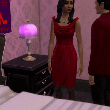 The first interaction starts with one Sim sitting on the bed while the other leans over to give them a kiss on the cheek, followed by a kiss on the lips. It’s meant to be a softer, more affectionate moment between Sims, and works really well for couples that are already comfortable with each other. It’s a simple interaction, but I thought it was really cute and nice for more calm, romantic storytelling moments.